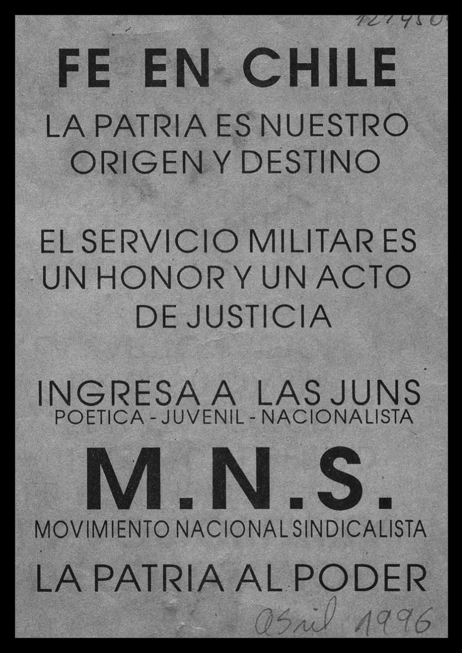 A finales del año 1947, haría aparición en Chile la publicación ‘Bandera Negra’; en torno a ella venía gestándose el desarrollo del Nacional Sindicalismo chileno, reuniendo a la juventud nacionalista de la posguerra e influenciado por diferentes antecedentes en el nacionalismo histórico en Chile, tal como el ‘Partido Nacionalista’, el ‘Movimiento Nacional Socialista’ [M.N.S.] y el ‘Movimiento Nacionalista de Chile’ [MNCH], así también por el antecedente de agrupaciones en otros países, tales como la Falange Española de las JONS, el Rexismo belga y el Legionarismo rumano.